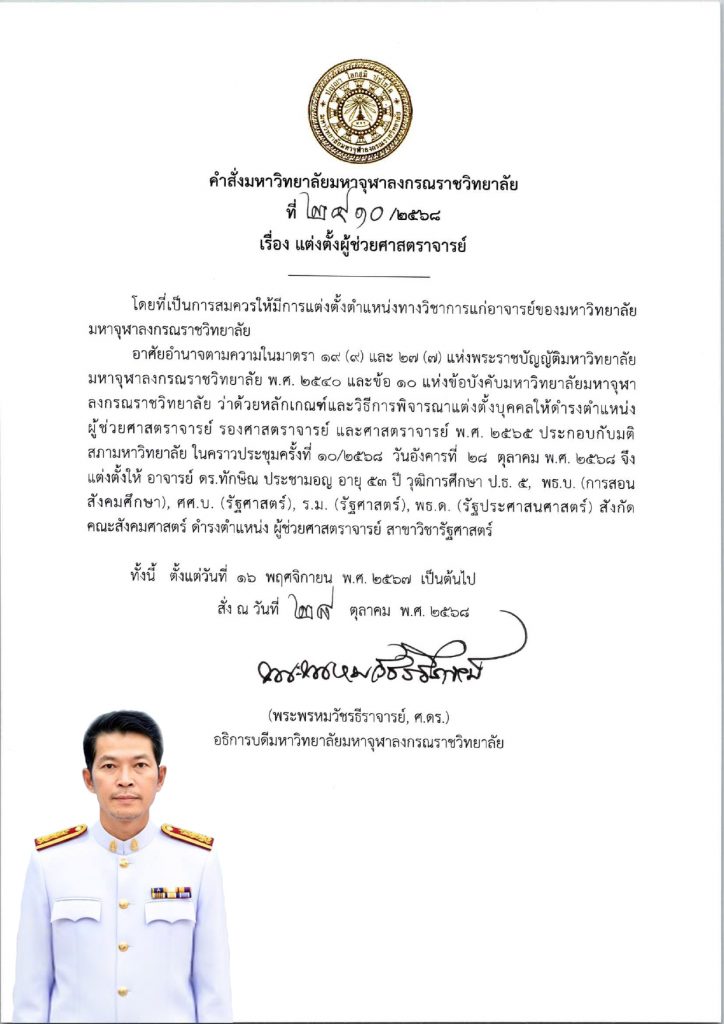 มหาวิทยาลัยมหาจุฬาลงกรณราชวิทยาลัย แต่งตั้งให้ อาจารย์ ดร.ทักษิณ ประชามอญ อายุ ๕๓ ปี วุฒิการศึกษา ป.ธ. ๕, พธ.บ. (การสอนสังคมศึกษา), ศศ.บ. (รัฐศาสตร์), ร.ม. (รัฐศาสตร์) พธ.ด. (รัฐประศาสนศาสตร์) สังกัดคณะสังคมศาสตร์ ดำรงตำแหน่ง ผู้ช่วยศาสตราจารย์ สาขาวิชารัฐศาสตร์