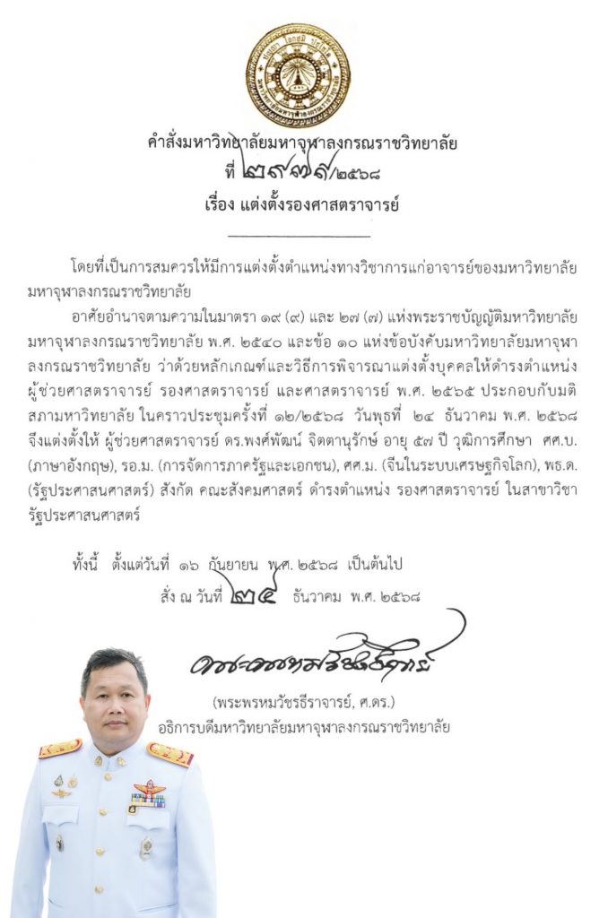 มหาวิทยาลัยมหาจุฬาลงกรณราชวิทยาลัย แต่งตั้งให้ ผู้ช่วยศาสตราจารย์ ดร.พงศ์พัฒน์ จิตตานุรักษ์ อายุ ๕๗ ปี วุฒิการศึกษา ศศ.บ. (ภาษาอังกฤษ), รอ.ม. (การจัดการภาครัฐและเอกชน), ศศ.ม. (จีนในระบบเศรษฐกิจโลก), พธ.ด. (รัฐประศาสนศาสตร์) สังกัด คณะสังคมศาสตร์ ดำรงตำแหน่ง รองศาสตราจารย์ สาขาวิชารัฐประศาสนศาสตร์