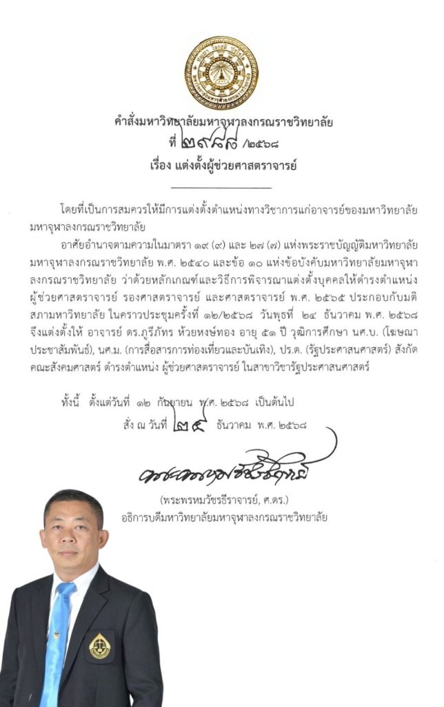 มหาวิทยาลัยมหาจุฬาลงกรณราชวิทยาลัย แต่งตั้งให้ อาจารย์ ดร.ภูรีภัทร ห้วยหงษ์ทอง อายุ ๕๑ ปี วุฒิการศึกษา นศ.บ. (โฆษณาประชาสัมพันธ์), นศ.ม. (การสื่อสารการท่องเที่ยวและบันเทิง), ปร.ด. (รัฐประศาสนศาสตร์) สังกัด คณะสังคมศาสตร์ ดำรงตำแหน่ง ผู้ช่วยศาสตราจารย์ สาขาวิชารัฐประศาสนศาสตร์