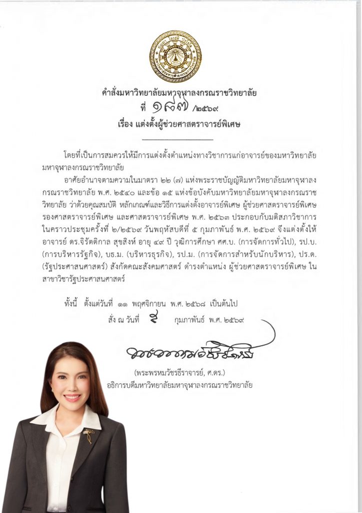 มหาวิทยาลัยมหาจุฬาลงกรณราชวิทยาลัย แต่งตั้งให้ อาจารย์ ดร.จิรัตติกาล สุขสิงห์ อายุ ๔๙ ปี วุฒิการศึกษา ศศ.บ. (การจัดการทั่วไป), รป.บ. (การบริหารรัฐกิจ), บธ.ม. (บริหารธุรกิจ), รป.ม. (การจัดการสำหรับนักบริหาร) ปร.ด. (รัฐประศาสนศาสตร์) สังกัดคณะสังคมศาสตร์ ดำรงตำแหน่ง ผู้ช่วยศาสตราจารย์พิเศษ สาขาวิชารัฐประศาสนศาสตร์