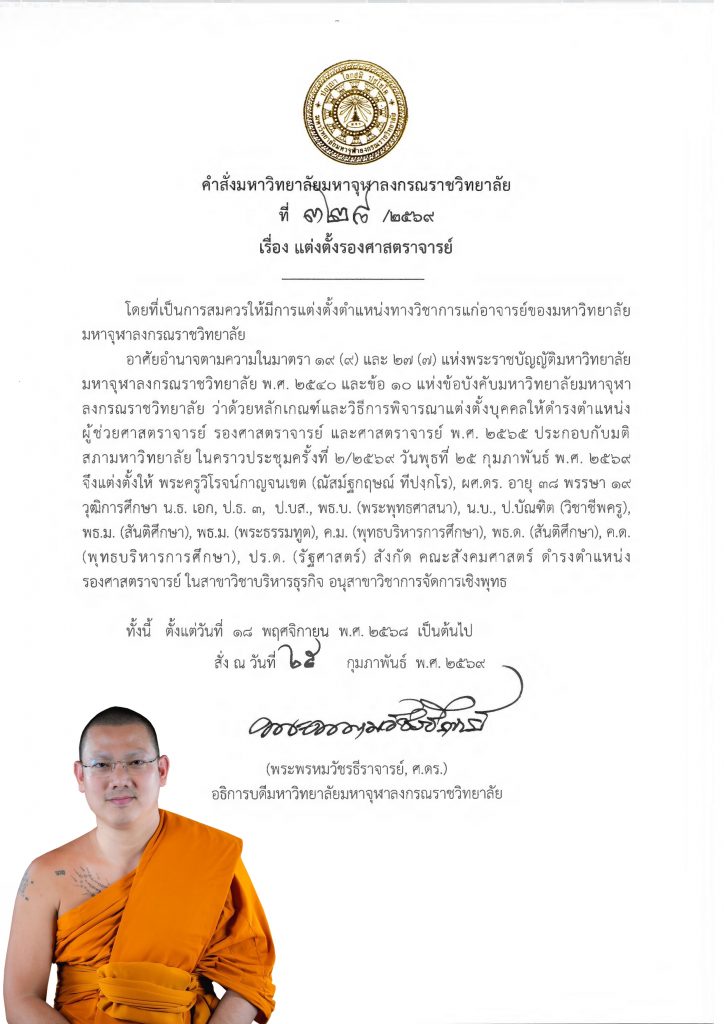 มหาวิทยาลัยมหาจุฬาลงกรณราชวิทยาลัย แต่งตั้งให้ พระครูวิโรจน์กาญจนเขต, ผศ.ดร. อายุ ๓๘ พรรษา ๑๙ วุฒิการศึกษา น.ธ. เอก, ป.ธ. ๓, ป.บส., พธ.บ. (พระพุทธศาสนา), น.บ., ป.บัณฑิต (วิชาชีพครู), พธ.ม. (สันติศึกษา), พธ.ม. (พระธรรมทูต), ค.ม. (พุทธบริหารการศึกษา), พธ.ด. (สันติศึกษา), ค.ด. (พุทธบริหารการศึกษา), ปร.ด. (รัฐศาสตร์) สังกัด คณะสังคมศาสตร์ ดำรงตำแหน่ง รองศาสตราจารย์ ในสาขาวิชาบริหารธุรกิจ อนุสาขาวิชาการจัดการเชิงพุทธ
