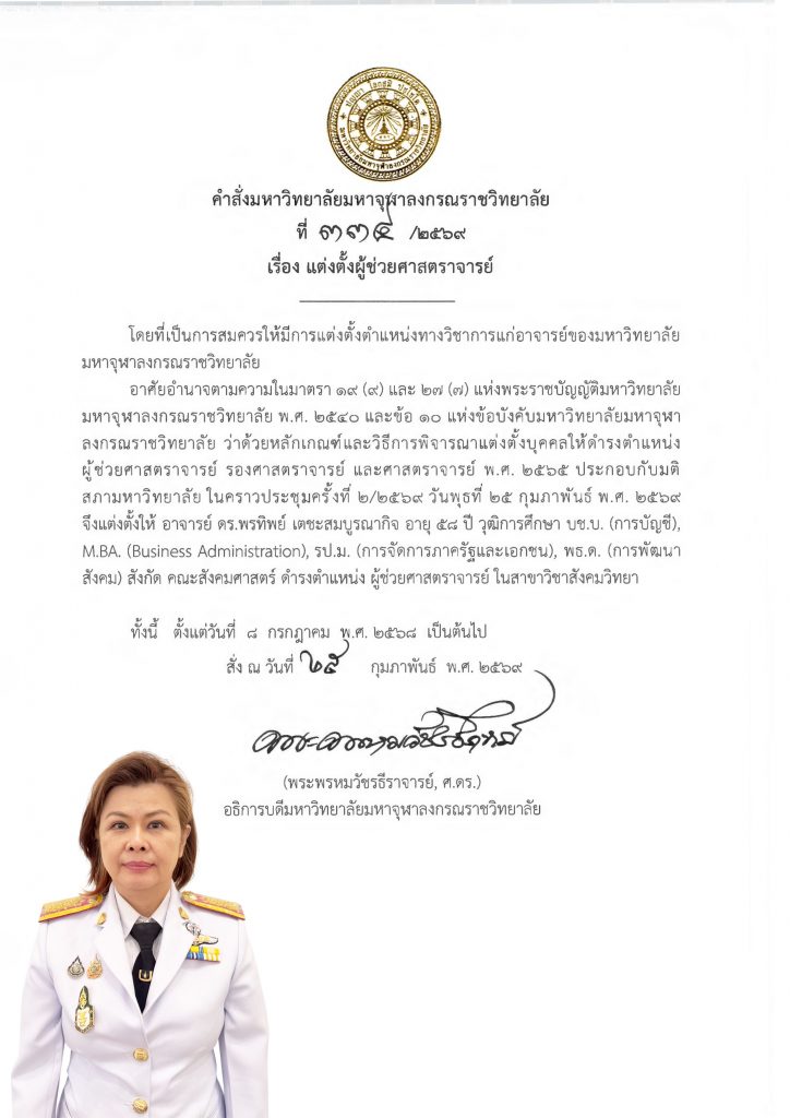 มหาวิทยาลัยมหาจุฬาลงกรณราชวิทยาลัย แต่งตั้งให้ อาจารย์ ดร.พรทิพย์ เตชะสมบูรณากิจ อายุ ๕๘ วุฒิการศึกษา บช.บ. (การบัญชี), M.BA. (Business Administration), รป.ม. (การจัดการภาครัฐและเอกชน), พธ.ด. (การพัฒนาสังคม) สังกัด คณะสังคมศาสตร์ ดำรงตำแหน่ง ผู้ช่วยศาสตราจารย์ สาขาวิชาสังคมศึกษา