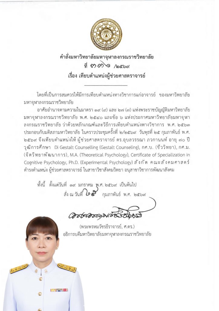 มหาวิทยาลัยมหาจุฬาลงกรณราชวิทยาลัย แต่งตั้งให้ ผู้ช่วยศาสตราจารย์ ดร.อุบลวรรณา ภวกานันท์ อายุ ๗๐ ปี วุฒิการศึกษา Di Gestalt Counselling (Gestalt Counseling), กศ.บ. (ชีววิทยา), กศ.ม. (จิตวิทยาพัฒนาการ), M.A. (Theoretical Psychology), Certificate of Specialization in Cognitive Psychology, Ph.D. (Experimental Psychology) สังกัด คณะสังคมศาสตร์ ดำรงตำแหน่ง ผู้ช่วยศาสตราจารย์ สาขาวิชาสังคมวิทยา อนุสาขาวิชาการพัฒนาสังคม