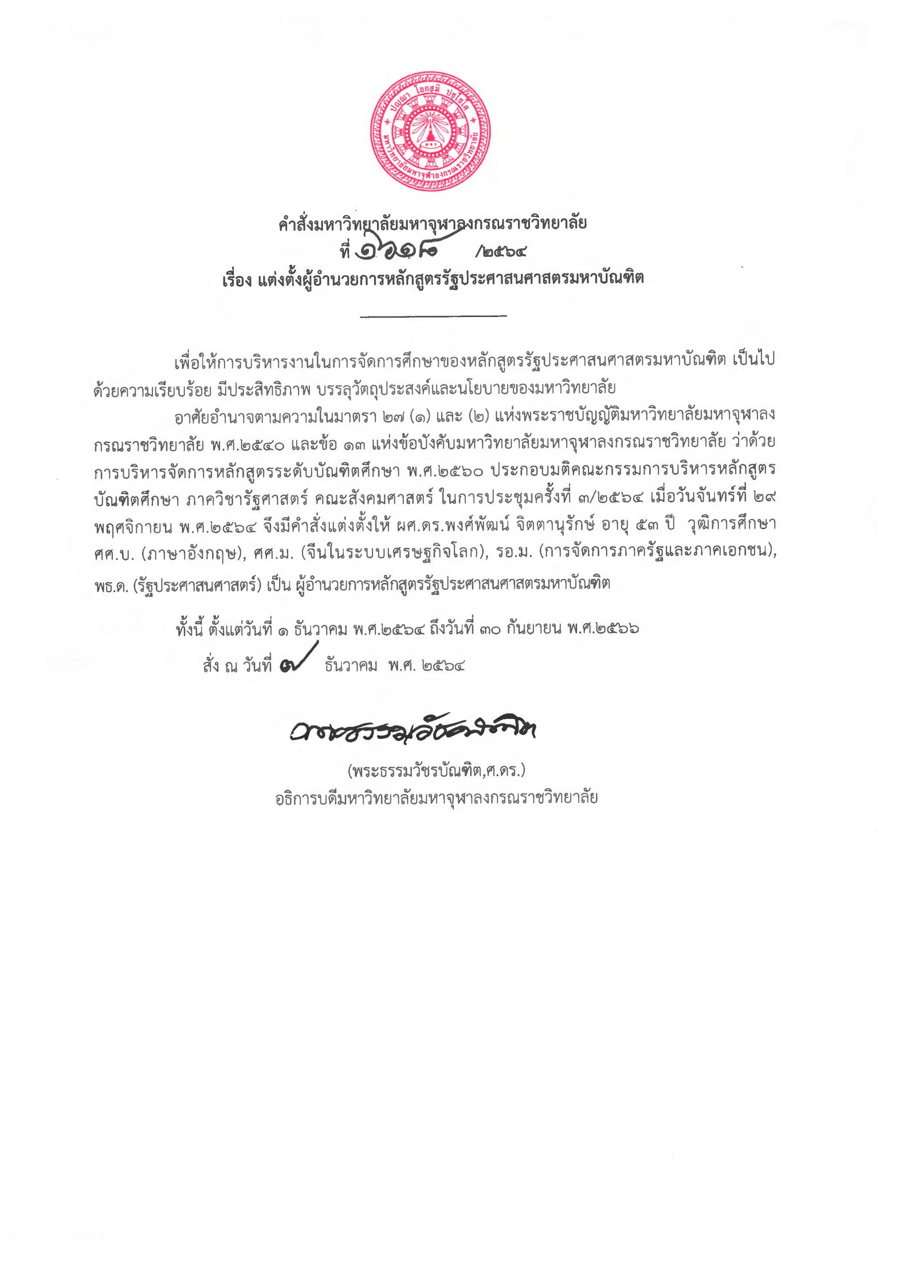 พ.ศ. ๒๕๖๔ – ปัจจุบัน ผู้อำนวยการหลักสูตรรัฐประศาสนศาสตรมหาบัณฑิต (PDF)