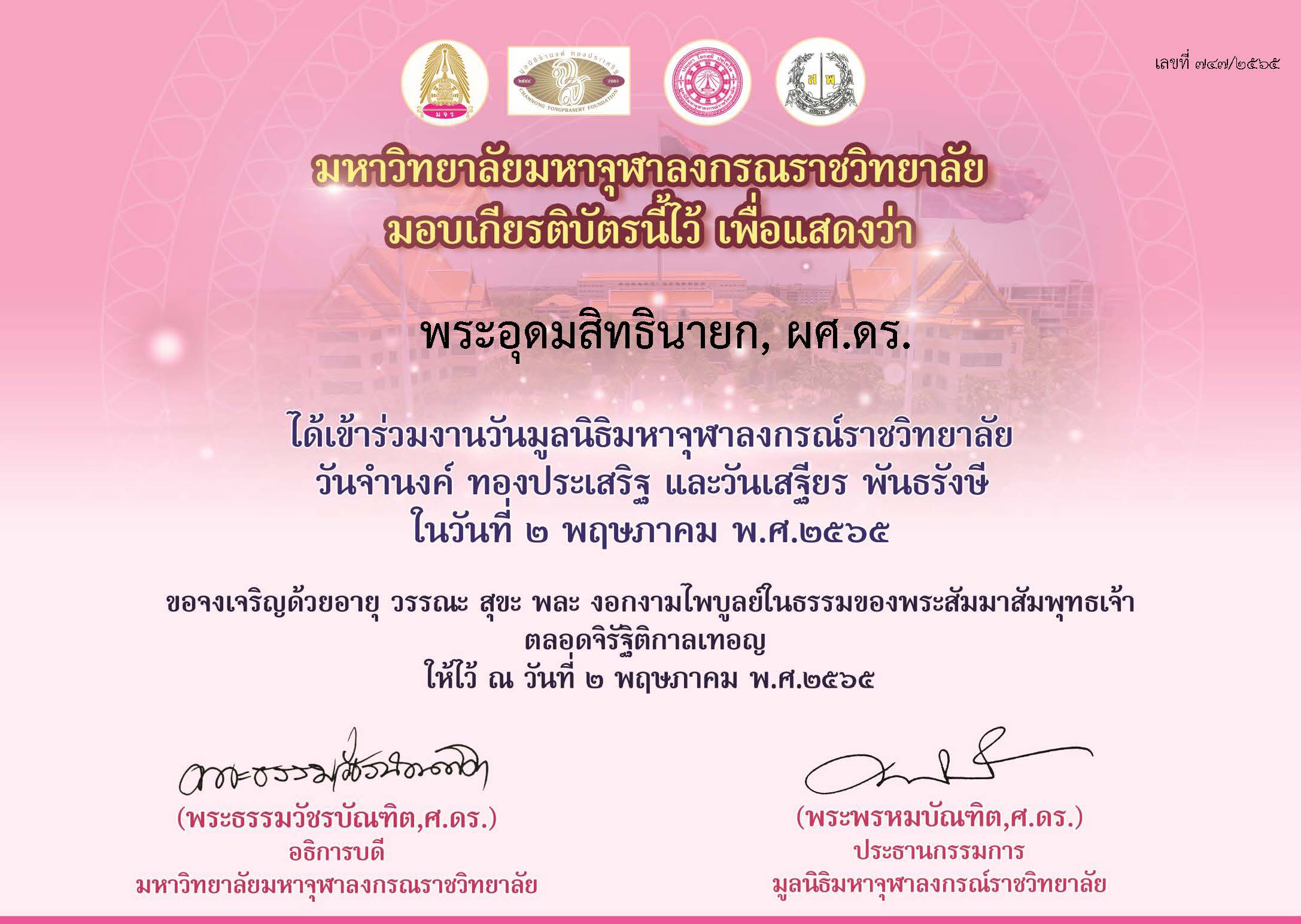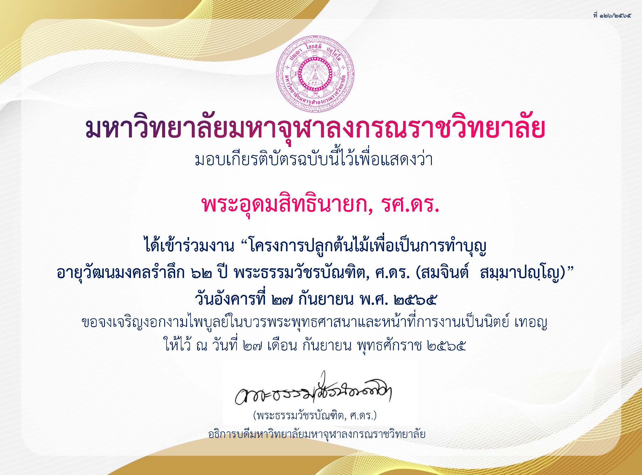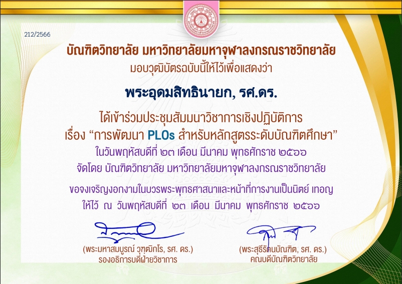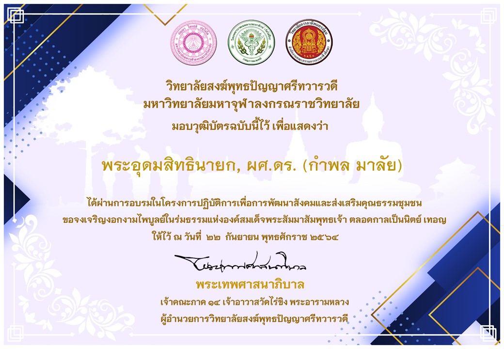 | ๒๔๐ | วันที่ ๓๐ กันยายน ๒๕๖๕ ได้เข้าร่วมงาน “วันกตัญญู” รำลึกถึงคุณุปการผู้เกษียณอายุการทำงาน ประจำปี ๒๕๖๕ จัดโดยมหาวิทยาลัยมหาจุฬาลงกรณราชวิทยาลัย | (เกียรติบัตร) |