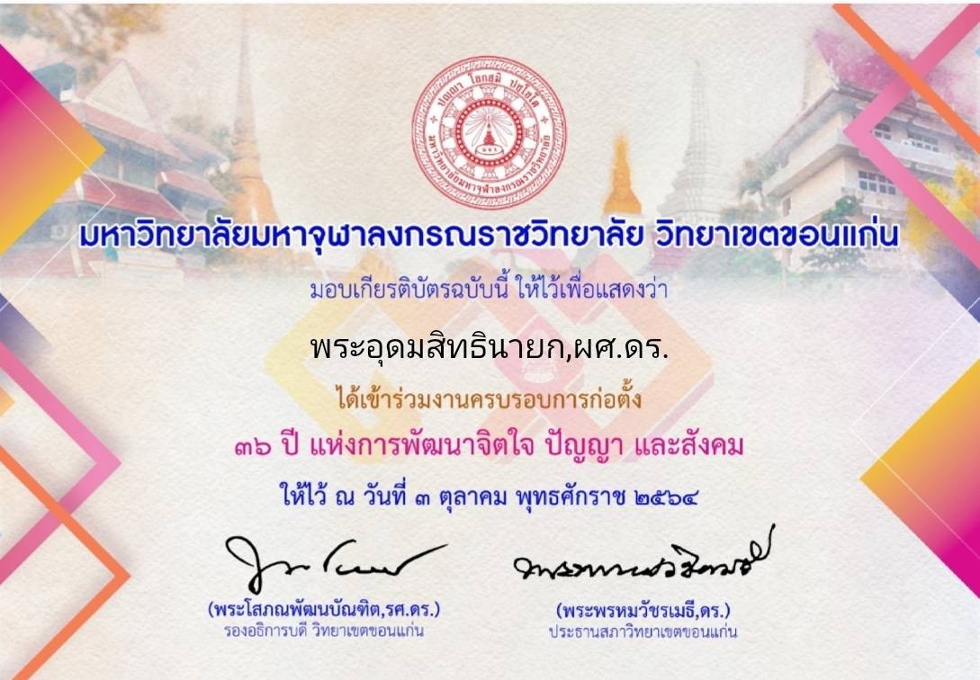| ๒๒๑ | วันที่ ๓ ตุลาคม ๒๕๖๔ ได้เข้าร่วมงานครบรอบก่อตั้ง ๓๖ ปี แห่งการพฒนาจิตใจ ปัญญา และสังคม จัดโดย มจร วข.ขอนแก่น | (เกียรติบัตร) |