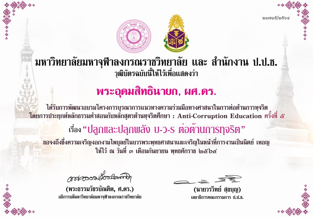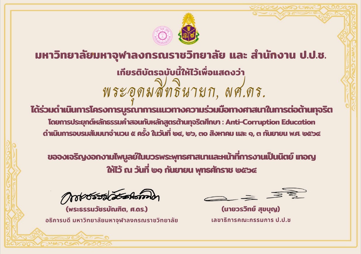 | ๑๘๖ | วันที่ ๒๒ กันยายน ๒๕๖๔ ได้รับการอบรมโครงการบูรณาการแนวทางความร่วมมือทางศาสนาในการต่อต้านการทุจริต โดยการประยุกต์หลักธรรมคำสอนกับหลักสูตรต้านทุจริตศึกษา ครั้งที่ ๒ จัดโดย มมร และ สำนักงาน ป.ป.ช. | (วุฒิบัตร) |