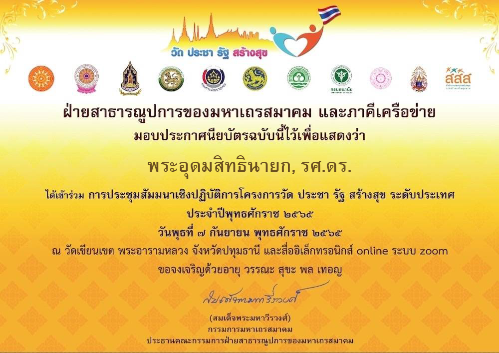 | ๒๓๖ | วันที่ ๗ กันยายน ๒๕๖๕ ได้เข้าร่วมการประชุมสัมมนาเชิงปฏิบัติการโครงการวัด ประชา รัฐ สร้างสุข ระดับประเทศ ประจำปีพุทธศักราช ๒๕๖๕ ณ วัดเขียนเขต พระอารามหลวง จังหวัดปทุมธานี และสื่ออิเล็กทรอนิกส์ online ระบบ zoom จัดโดยฝ่ายสาธารณูปการของมหาเถรสมาคม และภาคีเครือข่าย | (ใบประกาศนียบัตร) |