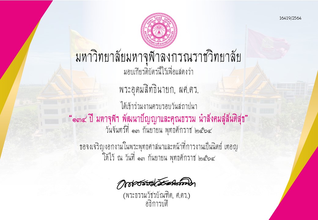 | ๒๓๗ | วันที่ ๑๓ กันยายน ๒๕๖๕ ได้เข้าร่วมงานครบรอบวันสถาปนา “๑๓๕ ปี มหาจุฬาฯ พัฒนาปัญญาและคุณธรรม นำพุทธนวัตกรรมสู่สังคมโลก” จัดโดยมหาวิทยาลัยมหาจุฬาลงกรณราชวิทยาลัย | (เกียรติบัตร) |