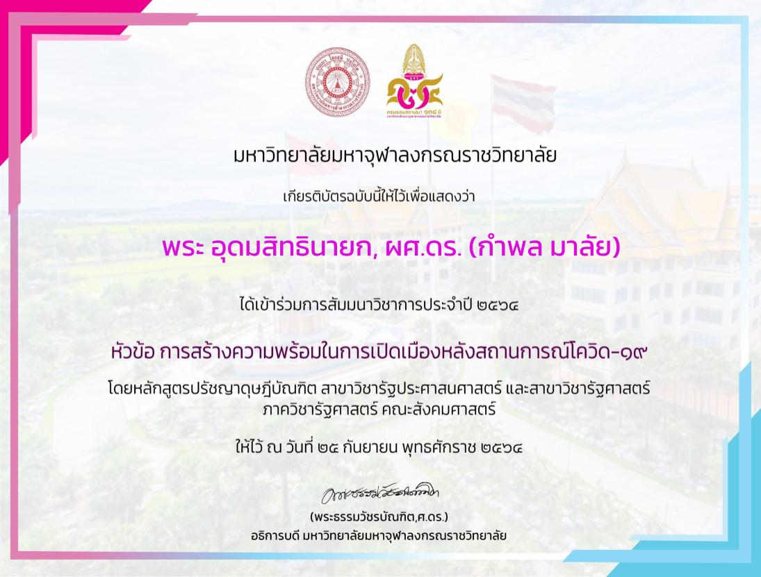 | ๑๕๙ | วันที่ ๑๖ กันยายน ๒๕๖๔ ได้เข้าร่วมโครงการอภิปรายและเสวนาทางวิชาการออนไลน์ “บทบาทพระสงฆ์ในวิกฤตโควิด-๑๙ (COVID-19) ที่มีต่อสังคมไทย : ความท้าทาย การปรับตัว ประเด็นทางสังคม” | (เกียรติบัตร) |
