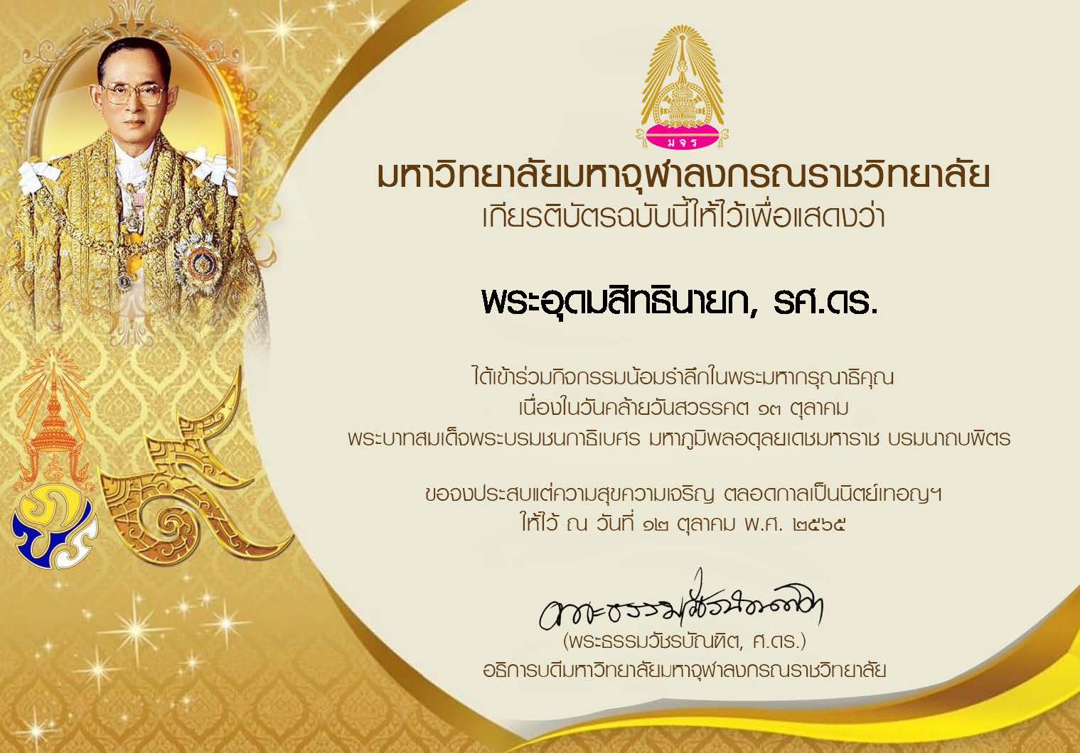 | ๒๔๒ | วันที่ ๑๒ ตุลาคม ๒๕๖๕ ได้เข้าร่วมกิจกรรมน้อมรำลึกในพระมหากรุณาธิคุณ เนื่องในวันคล้ายวันสวรรคต ๑๓ ตุลาคม พระบาทสมเด็จพระบรมชนกาธิเบศร มหาภูมิพลอดุลยเดชมหาราช บรมนาถบพิตร จัดโดยมหาวิทยาลัยมหาจุฬาลงกรณราชวิทยาลัย | (เกียรติบัตร) |