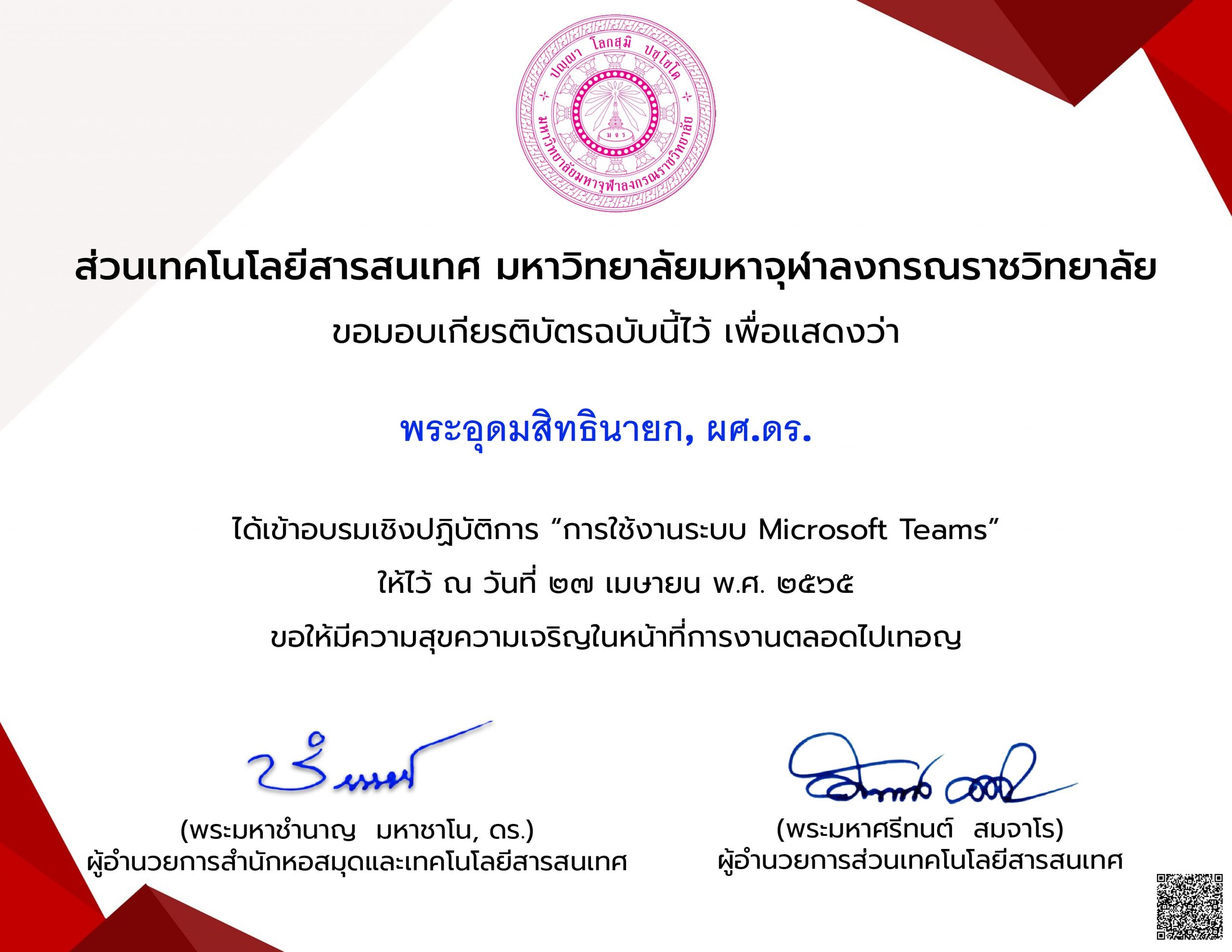 | ๒๓๐ | วันที่ ๒๗ เมษายน ๒๕๖๕ ได้เข้าอบรมเชิงปฏิบัติการ “การใช้งานระบบ Microsoft Teams” จัดโดย ส่วนเทคโนโลยีสารสนเทศ มจร | (เกียรติบัตร) |