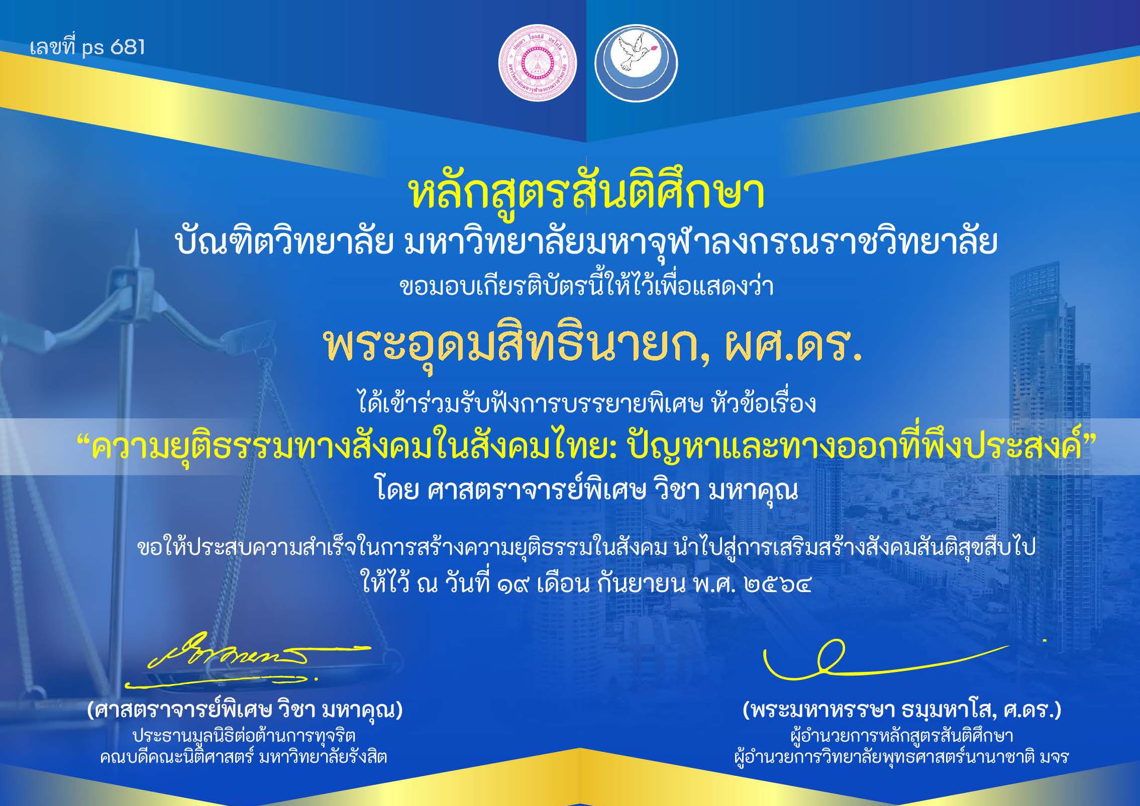 | ๑๗๓ | วันที่ ๑๙ กันยายน ๒๕๖๔ ได้เข้าร่วมรับฟังการบรรยายพิเศษ หัวข้อเรื่อง “ความยุติธรรมทางสังคมในสังคมไทย: ปัญหาและทางออกที่พึงประสงค์” โดย ศาสตราจารย์พิเศษ วิชา มหาคุณ จัดโดย หลักสูตรสันติศึกษา มจร | (เกียรติบัตร) |
