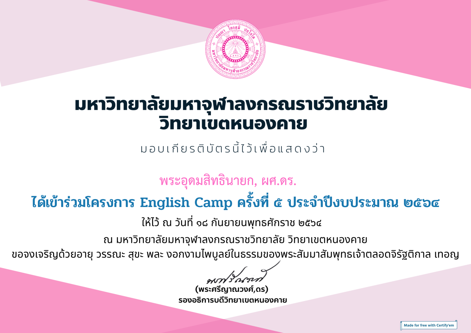 | ๑๖๘ | วันที่ ๑๘ กันยายน ๒๕๖๔ ได้เข้าร่วมโครงการ English Camp ครั้งที่ ๕ ประจำปีงบประมาณ ๒๕๖๔ จัดโดย มจร วิทยาเขตหนองคาย | (เกียรติบัตร) |