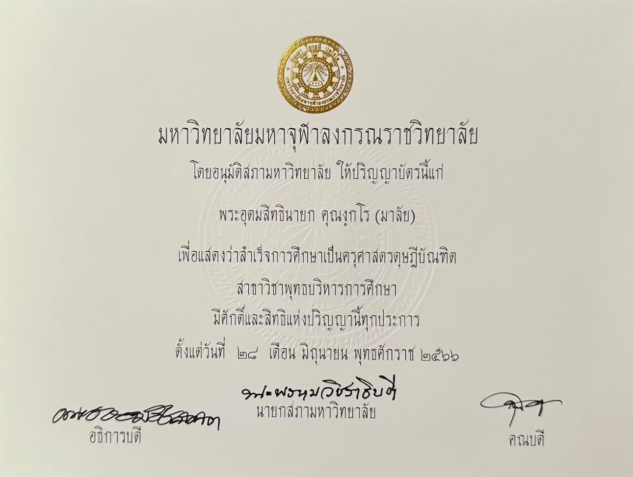 | พ.ศ. ๒๕๖๖ | ครุศาสตรดุษฎีบัณฑิต สาขาวิชาพุทธบริหารการศึกษา | มหาวิทยาลัยมหาจุฬาลงกรณราชวิทยาลัย | (PDF) |