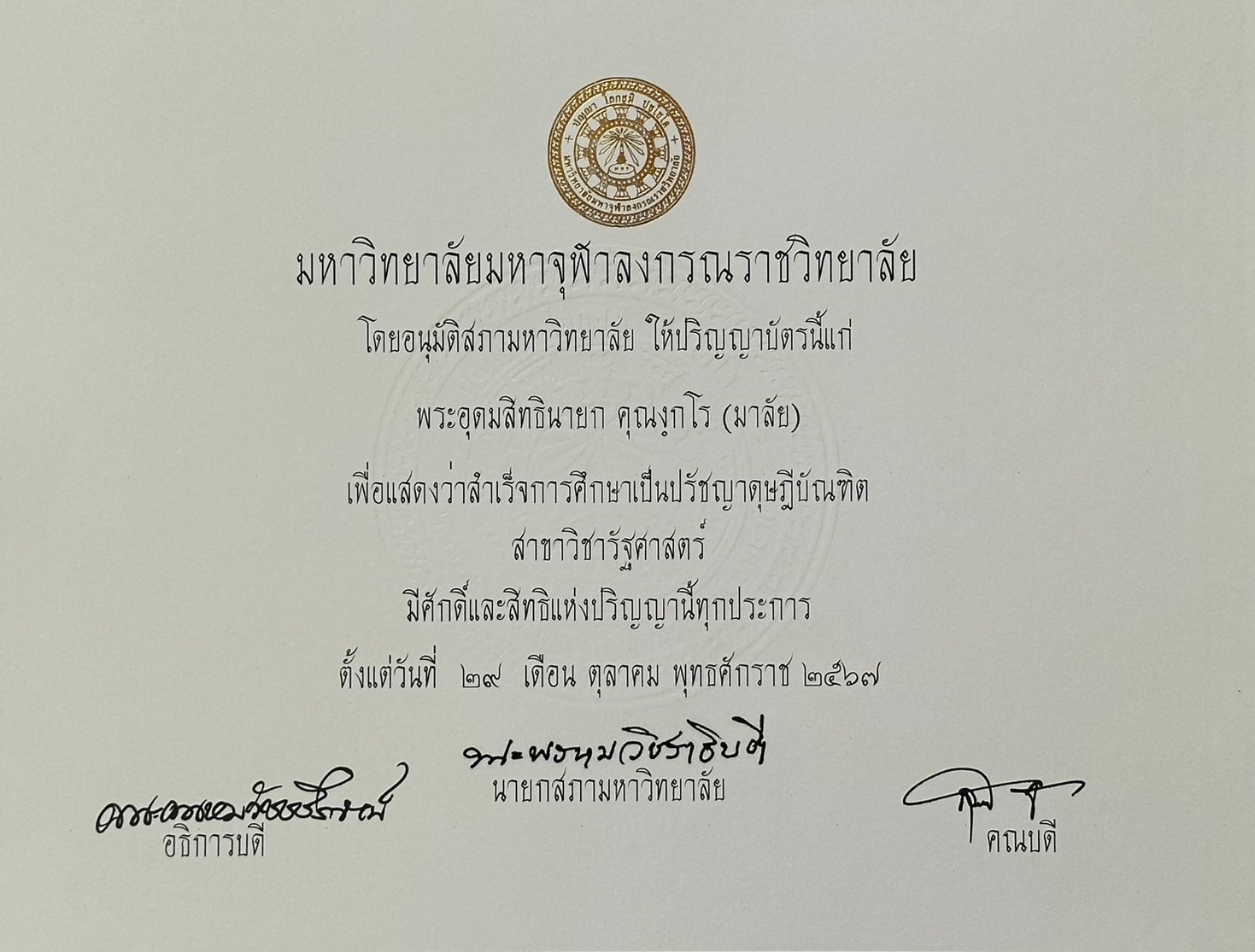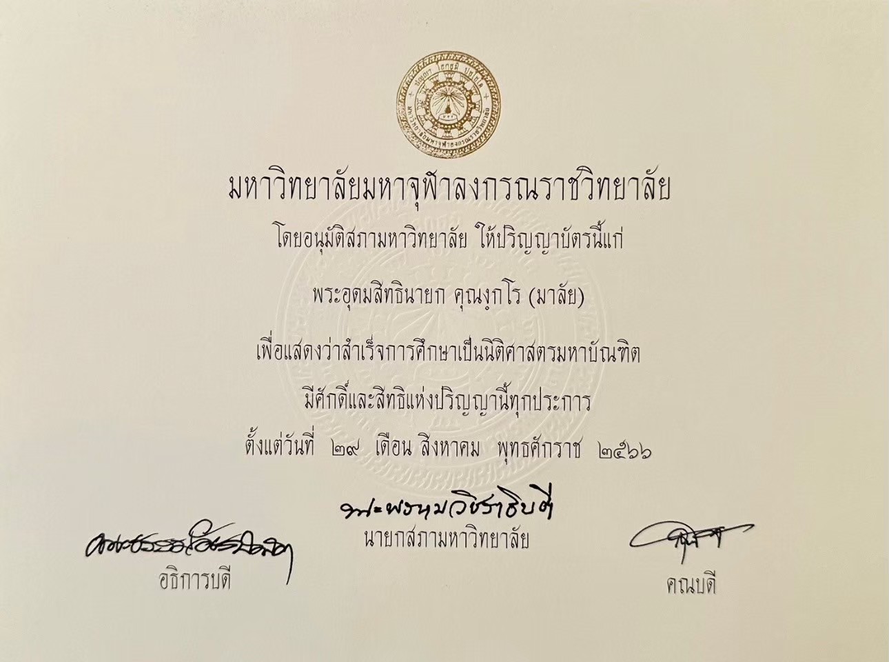 | พ.ศ. ๒๕๖๖ | นิติศาสตรมหาบัณฑิต | มหาวิทยาลัยมหาจุฬาลงกรณราชวิทยาลัย | (PDF) |